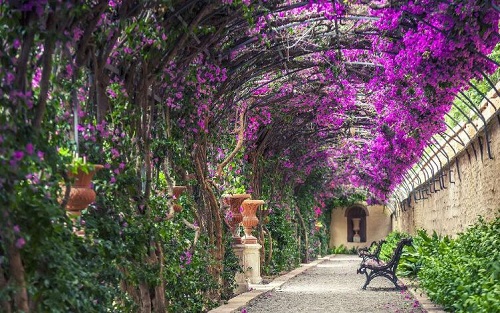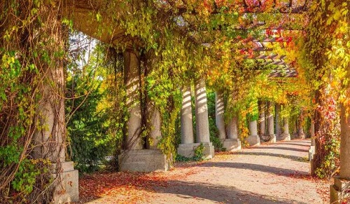 雙柱花架好似以攀援植物作頂?shù)男蓓?。值得注意的是供植物攀援的花架板,其平面排列可等?一般每50厘米左右),也可不等距,板間嵌入花架砧,取得光影和虛實(shí)變化;其立面也不一定是直線的,可曲線、折線,甚至由頂面延伸至兩側(cè)地面,如“滾地龍”一般。