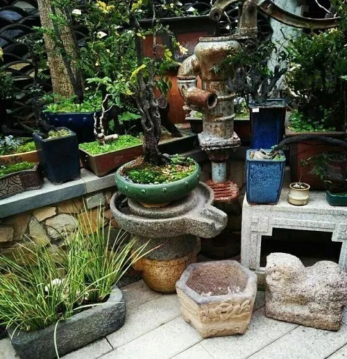 石缸養(yǎng)蓮植蒲,石磨鋪地做水景等等,