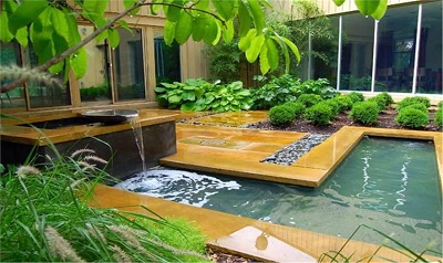 在這個小花園的中間,水流從特制的銅碗流出,與L形狀的水池匯聚到一起。周邊的植物分別是黃楊木、玉簪花、白銀蓮花、黑竹以及草本植物。
