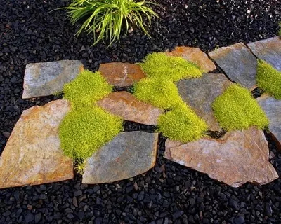 在砂漿中鋪鵝卵石或圓石能夠拼出很多好看的圖案。缺點就是時間久了,卵石容易被踢落,也不太好清潔,適合用在自然風格的小徑上。