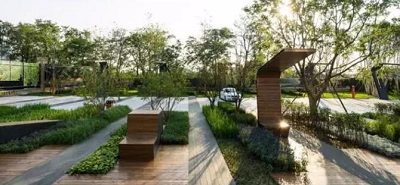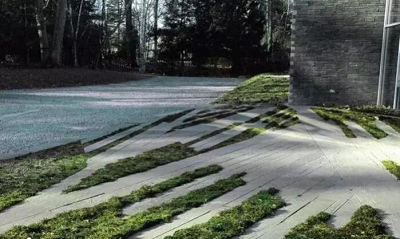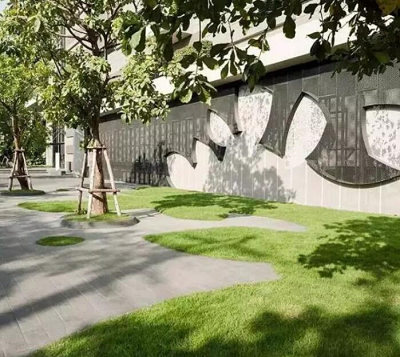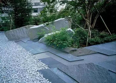 軟硬景或不同質(zhì)地的材料在結合處處理成相互穿插,視覺效果很有張力,不過對于在人流較大的區(qū)域軟硬景穿插的做法植物一般不會長的太好,而且施工工藝要求較高,不建議使用。