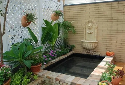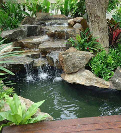 別墅庭院水景通常以人工化水景為多。根據(jù)別墅庭院空間的不同,采取多種手法進行引水造景(如疊水溪流、瀑布、涉水池等),在場地中有自然水體的景觀要保留利用,進行綜合設(shè)計,使自然水景與人工水景融為一體。別墅庭院水景設(shè)計要借助水的動態(tài)效果營造充滿活力的居住氛圍。