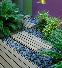 在別墅室內(nèi)中庭中用于硬質(zhì)景觀制作的有砂和人造石等材料。室內(nèi)裝飾用砂主要是指白砂,這種白砂主要在日本庭院枯山水中被用來(lái)象征大海和雪地。在白砂上用工具耙出波紋形狀以象征海浪。